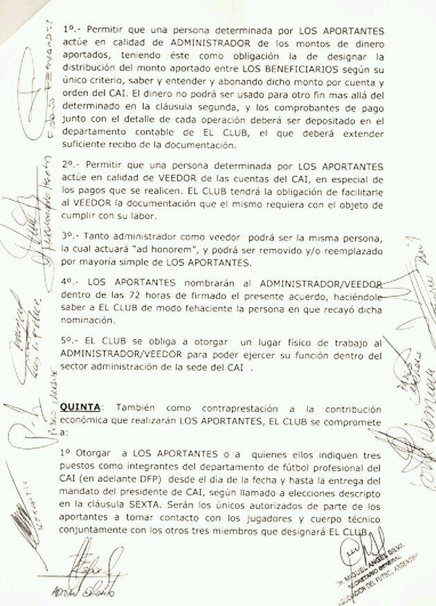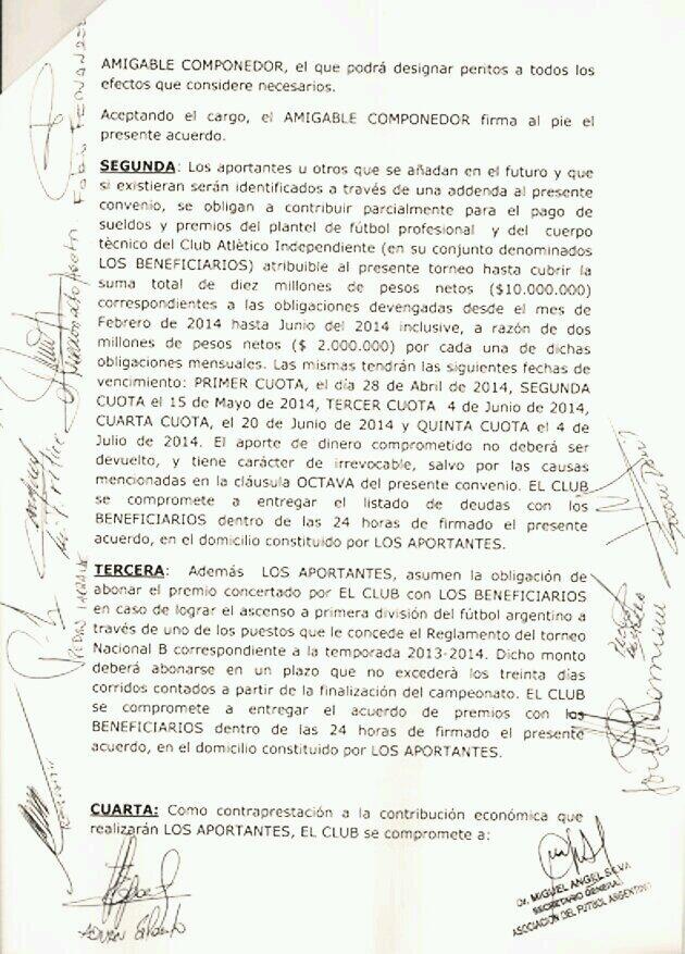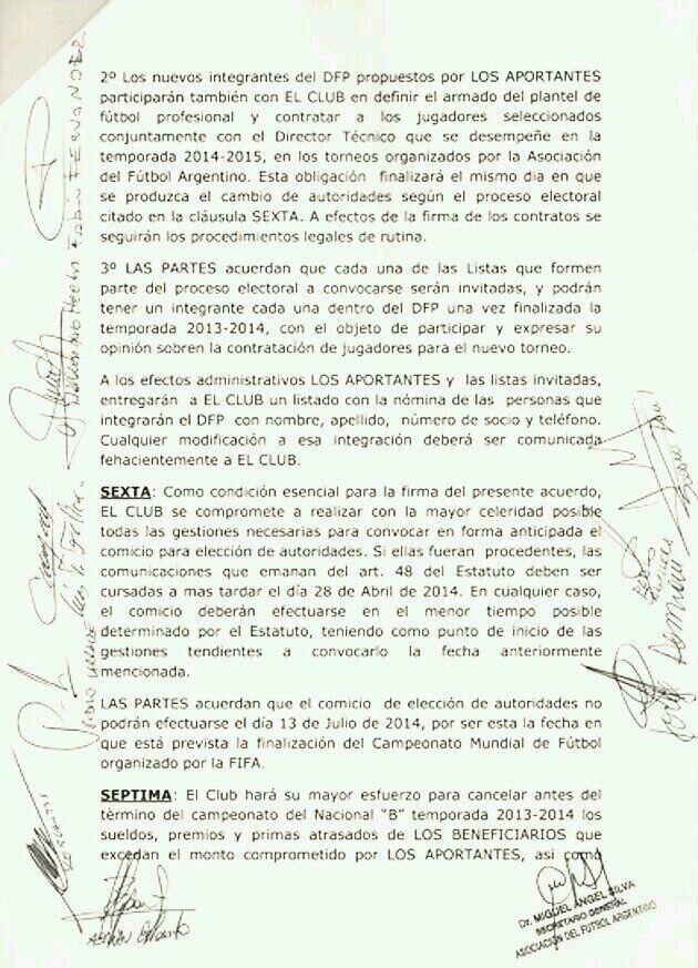 Este es el texto completo del acuerdo, publicado en la página oficial del club.- La primera hoja es más corta, ya que han sido recortados los encabezados, donde figuran seguramente domicilios de los firmantes y por seguridad se ha evitado dar a conocer.