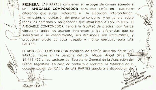 El AMIGABLE COMPONEDOR escogido de común acuerdo entre LAS PARTES, recae en la persona del Dr. Miguel Ángel Silva, Dni ——— en su carácter de Secretario General de la Asociación del Fútbol Argentino. En caso de conflicto o reclamo, la totalidad de la documentación del CAI o de LAS PARTES quedará a disposición del AMIGABLE COMPONEDOR, el que podrá designar peritos a todos los efectos que considere necesarios.