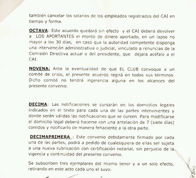 OCTAVA: Este acuerdo quedará sin efecto y el CAI deberá devolver a LOS APORTANTES el monto de dinero aportado, en un lapso no mayor a los 30 días, en caso que la autoridad competente disponga una intervención administrativa o judicial, vinculado a renuncias de la Comisión Directiva actual o del presidente, Sr. Víctor Javier Cantero que dejara acéfalo a el CAI.
