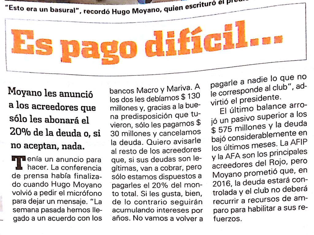 Nota de Olé hoy, dando cuenta de algunos dichos de Hugo Moyano en la reinauguración de la pensión de Domínico ayer sobre probebles acuerdos de pago.