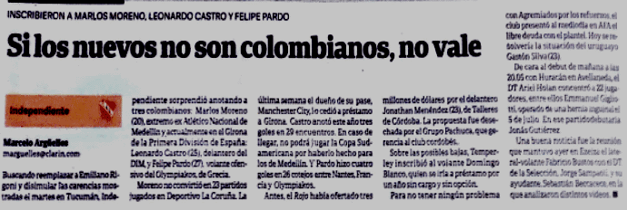 Esta es la nota de Clarín hoy 25-8-17 sobre Independiente, y la anotación de tres jugadores colombianos: Leonardo Castro (25 años), Felipe Pardo (27 años) y Marlos Moreno (20 años), todos jugadores de ataque.-