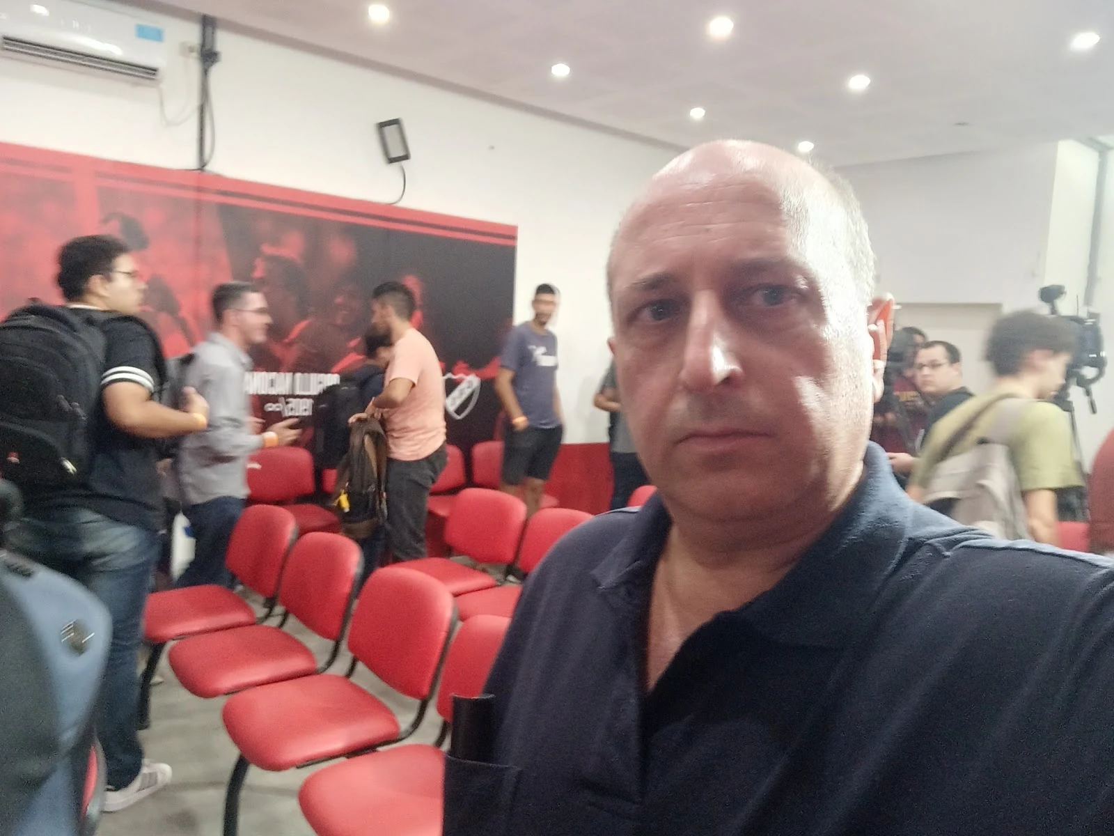 El autor de esta nota, en la previa del partido y luego en la suspendida conferencia de prensa.-